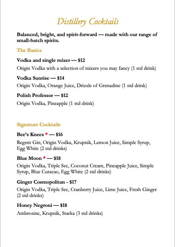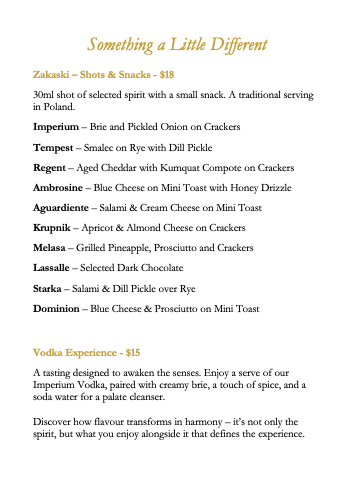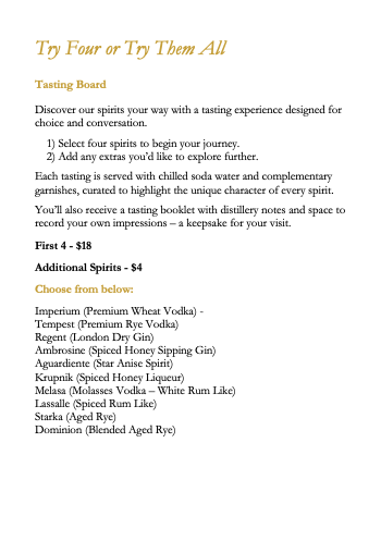 Each dish reflects the same philosophy as our distilling: quality ingredients, crafted with care, designed to delight. whether you're joining us for a casual bite or a full tasting flight, every flavour has been chosen to compliment the warmth of great company and the smoothness of our spirits.
